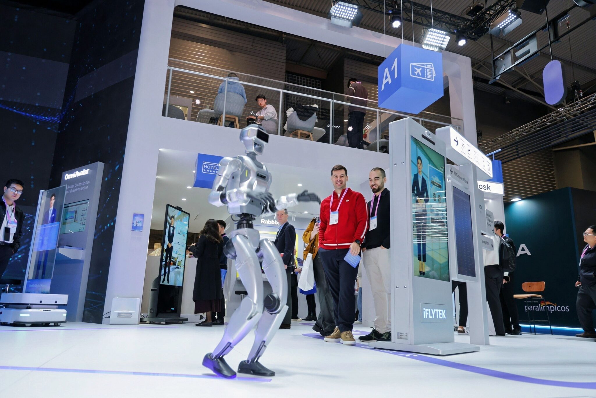 La pieza central de la exhibición es GuideX, la solución de humano virtual inteligente de iFLYTEK para entornos públicos de alto tráfico.